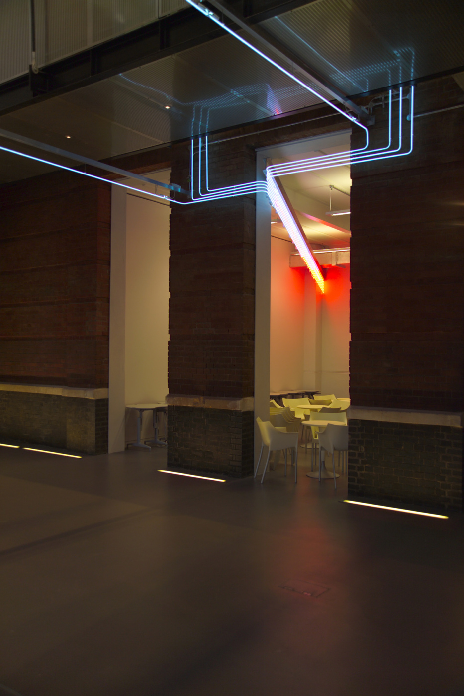 Pipedream has no tangible beginning or end and no obvious function. The pipes of light simply start out of nothing in the front atrium of the building they inhabit. Circuits with no source, they inhabit the space at different levels, floating and creating a feeling of lost purpose. They then come together on the back wall of the first atrium, a mass of neon pipe work ‘crowding’ through the central arch into the original, Victorian space beyond. Here they reform into a regimented line, stacking one above the other, and change colour from blue to red. They diagonally intersect the space until they disappear into the wall to reemerge the other side. At this point they transform again, twisting in unison into a vast column of light which ascends the full height of the second, internal atrium. This glowing neon cylinder accentuates the vertiginous height of this idiosyncratic internal space and is visible from a multitude of different points, the lift, the bridges, the spaces left by the original windows etc. Finally, it passes into the roof space and emerges in the pitched roof area, where its tip is visible from the top bridge, a towering chimney of light, emitting its energy back into the space to continue circulating.